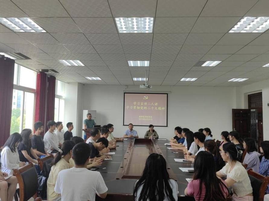 6月20日上午,在麻醉医学院会议室,党委书记周永媛面向麻醉医学院第一、第二学生党支部在校党员开展宣讲。她从“接续奋斗,追求千年梦想”“立足国情,开辟全新道路”“凝心聚力,推进复兴伟业”三个方面讲授中国式现代化的发展历程、五大特征和本质要求,对党的二十大精神进行了宣讲;韦锋副书记从自己参加脱贫攻坚的亲身经历和感受,宣讲了这十年我国取得的巨大成就。