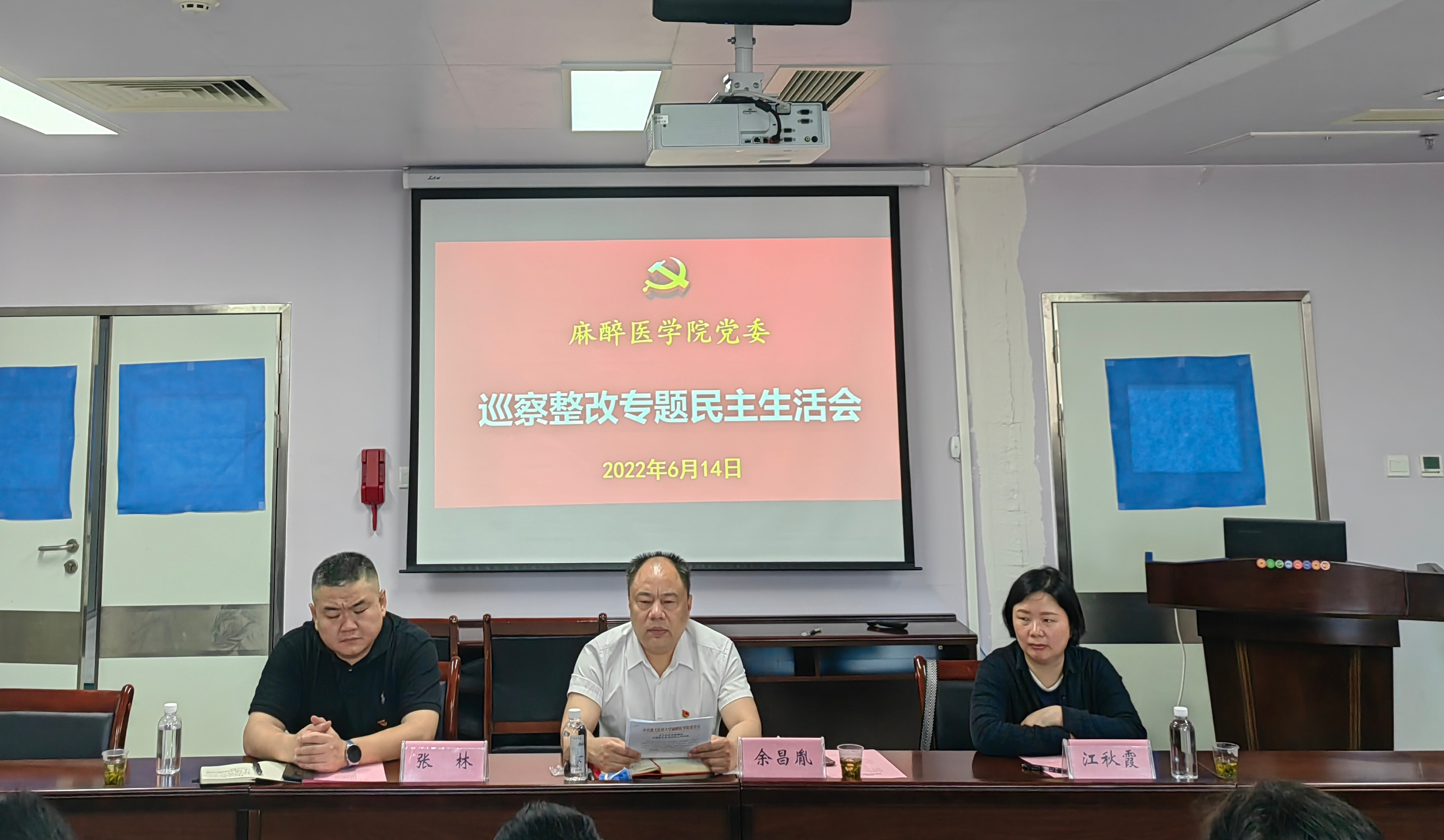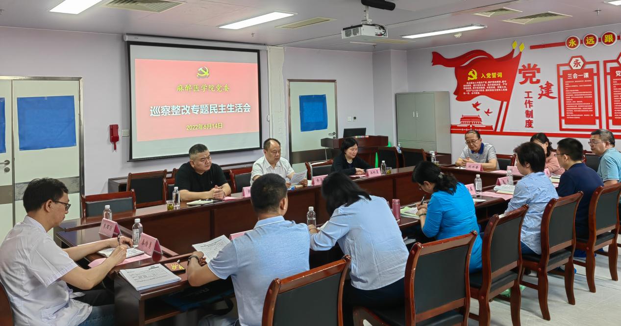 根据遵义医科大学一届党委第二轮巡察对麻醉医学院党委巡察整改的工作要求,6月14日下午3:00,麻醉医学院在大连路第四住院楼麻醉科党员活动室召开党委班子巡察整改专题民主生活会,遵义医科大学附属医院党委副书记、院长余昌胤、学校纪委第一监察室副主任张林、学校组织部副部长江秋霞到会指导。麻醉医学院院长刘兴奎、副院长张红及疼痛诊疗科党支部书记、科主任秦榜勇列席会议。麻醉医学院党委书记周永媛主持专题民主生活会。