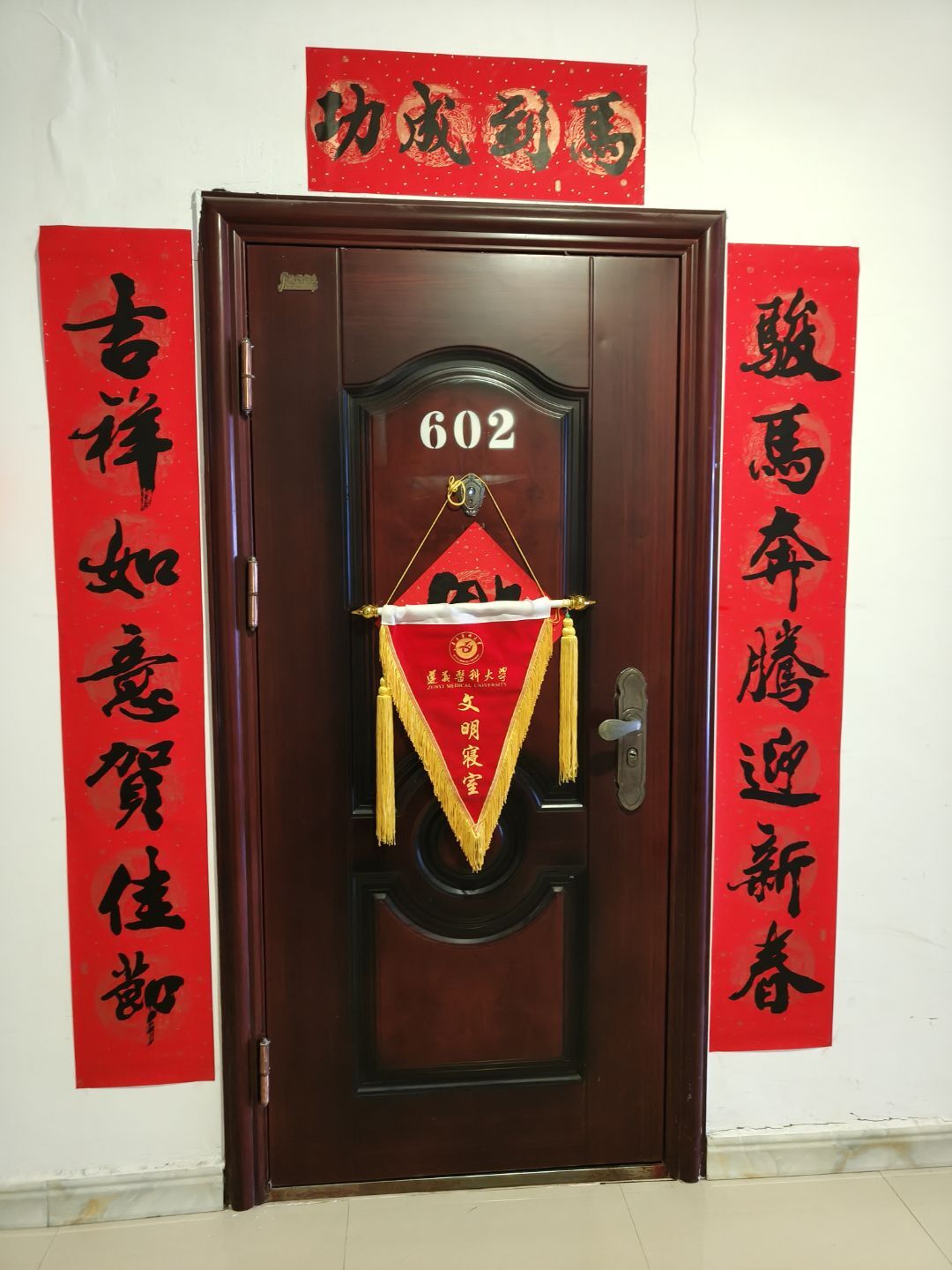 活动中,麻醉医学院党委及辅导员与兼职班主任等师生代表带着马年专属春联、“时光规划” 主题台历及简约便利贴,逐间走访寝室。“骏马奔腾迎新岁”“吉祥如意贺佳年” 等喜庆春联与福字,让宿舍瞬间洋溢起热闹年味,同学们手持春联合影留念,笑意盈盈。其中,台历方便记录学业节奏与生活安排,便利贴可随手标注日常事项,让祝福与实用属性巧妙融合。
